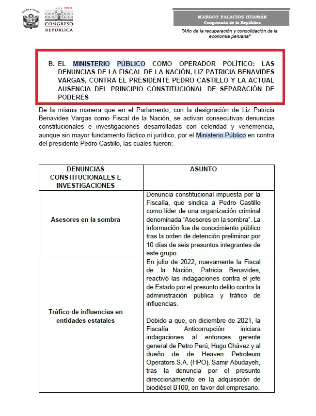 El documento califica la actuación del Ministerio Público, bajo la gestión de la exfiscal Patricia Benavides, como alineada a fines políticos. Se menciona que las investigaciones y denuncias contra el expresidente se iniciaron con celeridad, pero sin fundamentos sólidos.
