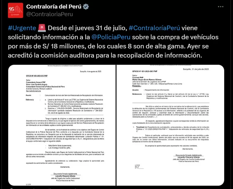 La Contraloría General de la República inició un proceso de recopilación de información en la Policía Nacional del Perú (PNP) tras conocerse la compra de vehículos de alta gama por más de 18 millones de soles.