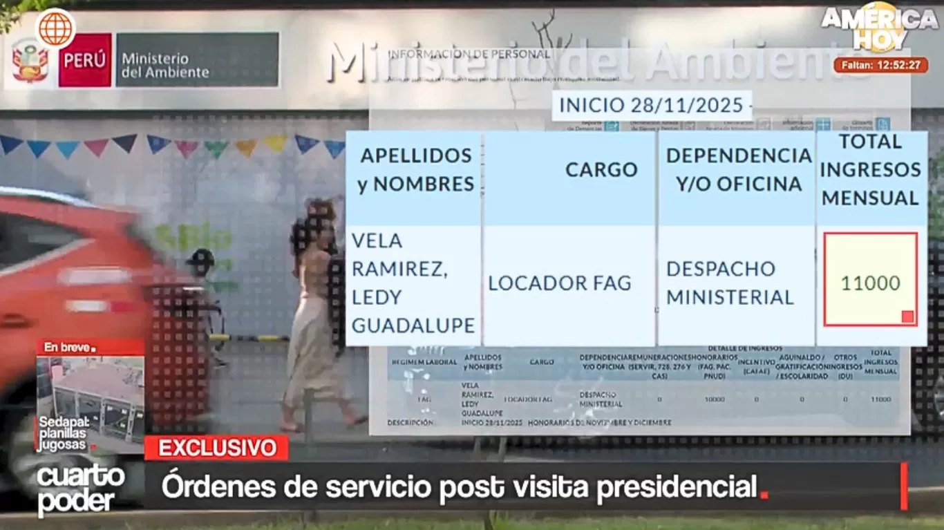 La Contraloría General de la República envió un oficio al Ministerio del Ambiente para solicitar información sobre la contratación de Guadalupe Vela Ramírez, luego de un reportaje del dominical Cuarto Poder que reveló reuniones previas en el Despacho Presidencial con José Jerí. La comunicación oficial informa el inicio de un servicio relacionado de recopilación de información.