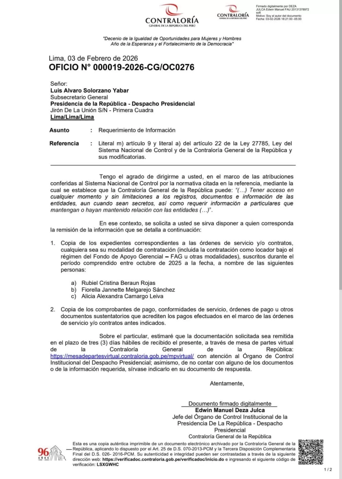 El documento fue dirigido a Luis Álvaro Solórzano Yabar, subsecretario general de la Presidencia de la República. En el oficio, la Contraloría señala que tiene la facultad de acceder, en cualquier momento y sin limitaciones, a registros, documentos e información de las entidades públicas, incluso cuando estos tengan carácter reservado.