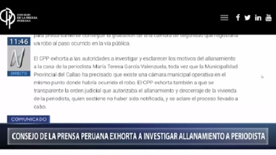 El Consejo de la Prensa Peruana exhortó a las autoridades a investigar el allanamiento a la casa de la jefa de la sección política del diario Expreso, María Teresa García, por parte de efectivos policiales y fiscales.
