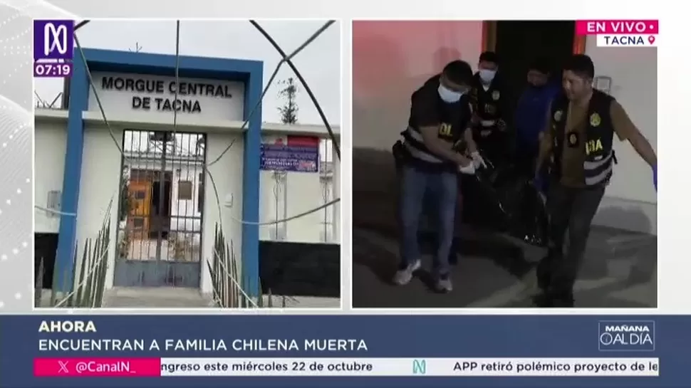 La policía informó que los cuerpos de una familia chilena fueron hallados en el distrito de Gregorio Albarracín López, Tacna, y permanecen en la Morgue Central de Tacna desde el pasado sábado mientras se realizan las necropsias correspondientes.