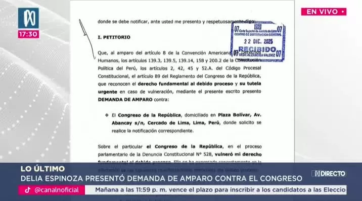 La exjueza suprema Delia Espinoza presentó una demanda de amparo contra el Congreso de la República tras ser inhabilitada por 10 años para ejercer funciones públicas. La acción legal busca anular la decisión adoptada por el Parlamento, argumentando una vulneración al derecho al debido proceso durante el procedimiento de acusación constitucional.