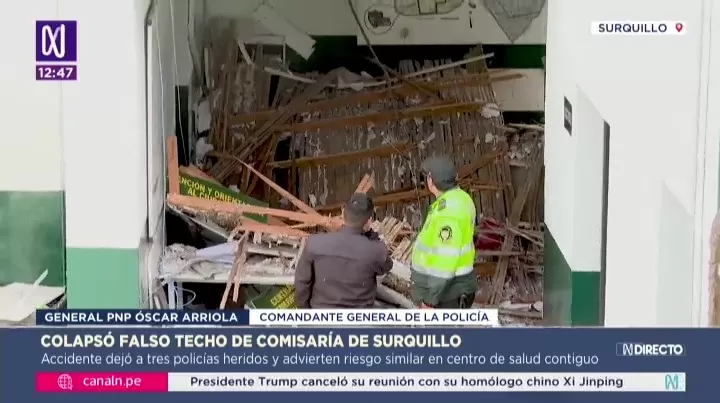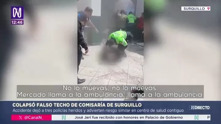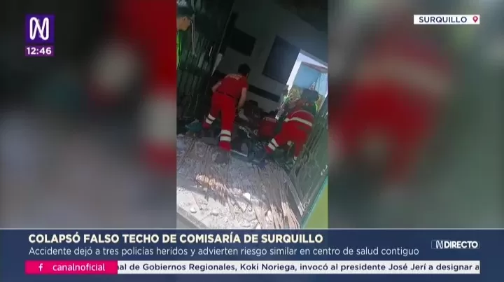 El falso techo de la comisaría de Surquillo colapsó y dejó tres policías heridos, identificados como Edgar Quispe Cristóbal, José Corzo Giraldo y Fernando Díaz Lenin. El derrumbe ocurrió en el área de atención al público y los agentes fueron trasladados al Hospital de la Policía. A un costado, el Centro Materno Infantil de Surquillo presenta rajaduras visibles y riesgo estructural. La Municipalidad ofreció un espacio temporal para las labores policiales. Vecinos critican la falta de mantenimiento y prevención por parte de las autoridades. El Ministerio del Interior evaluará las causas del incidente.