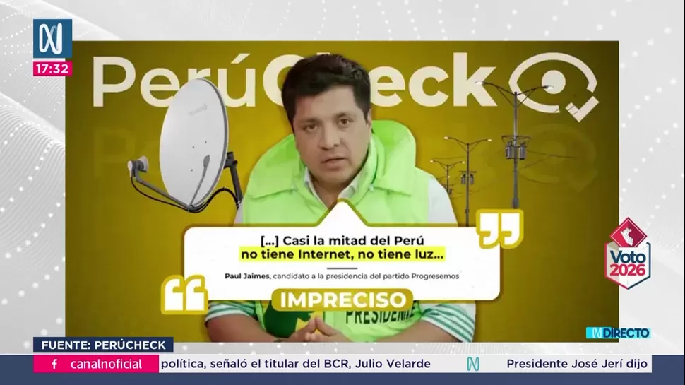 El espacio de verificación Perucheck, del Consejo de la Prensa Peruana, calificó como imprecisa la declaración del candidato Paul Jaimes, quien aseguró que casi la mitad del país no cuenta con acceso a internet ni energía eléctrica. La verificación se sustentó en datos de entidades oficiales.