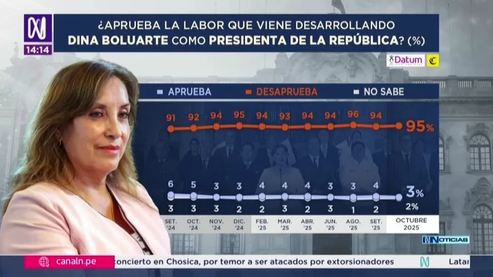 De acuerdo con los resultados, la desaprobación a Boluarte alcanzó el 95 %, mientras que el 2 % restante dijo no saber o no opinar. En septiembre de 2024, la entonces mandataria registraba un 6 % de aprobación, lo que confirma una tendencia sostenida de rechazo.