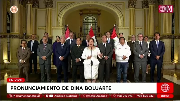 Minutos después de la aprobación de la vacancia de Dina Boluarte por parte del Congreso, la exmandataria se dirigió al país desde Palacio de Gobierno. El mensaje fue emitido a las 00:41 horas del viernes 10 de octubre y marcó su salida oficial del cargo, tras una gestión iniciada en diciembre de 2022. Boluarte estuvo acompañada por su gabinete ministerial durante el pronunciamiento.