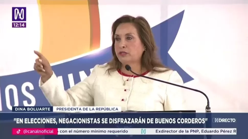 Boluarte advirtió que los denominados “negacionistas” podrían presentarse con discursos atractivos en la próxima campaña electoral. “Esas masas negacionistas se van a disfrazar de buenos corderos y van a salir con el discurso a ofrecer el oro y el moro. Pues no les crean”, señaló.