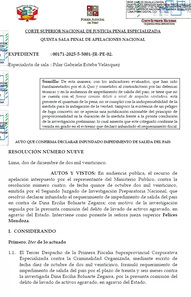 La Quinta Sala Penal de Apelaciones Nacional declaró infundado el recurso del Ministerio Público y confirmó que Dina Boluarte puede salir del país. El tribunal ratificó la resolución que rechazó imponer impedimento de salida por 36 meses en una investigación por presunto lavado de activos agravado. La Sala concluyó que no se acreditó sospecha reveladora, peligro de fuga ni indispensabilidad de la medida. También consideró desproporcionada la duración solicitada, debido a la proximidad del cierre de la investigación preliminar. La decisión confirma el fallo emitido por el juzgado de primera instancia.