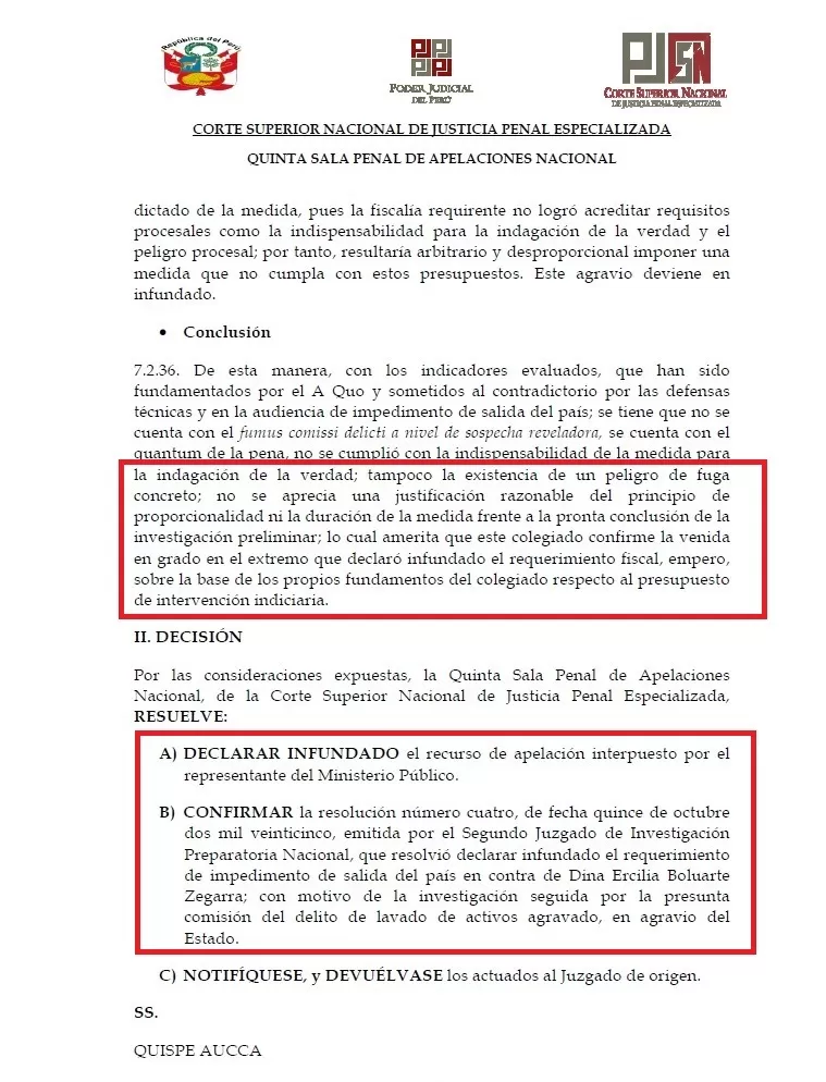 La resolución judicial confirma lo decidido previamente por el Segundo Juzgado de Investigación Preparatoria Nacional, que había rechazado el pedido fiscal al considerar que no se cumplían los presupuestos legales exigidos para restringir el derecho al libre tránsito de la investigada.