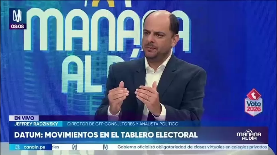 El analista político Jeffrey Radzinsky, director de GFP Consultores, señaló que un amplio sector del electorado aún no define su voto en las elecciones de 2026. En entrevista con Canal N, indicó que el 15,5% de ciudadanos afirma que todavía no sabe por quién votar.