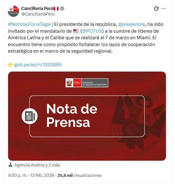 Según la Nota de Prensa 32-26, José Jerí recibió la invitación de Donald Trump para participar en la cumbre de alto nivel. El evento se desarrollará el 7 de marzo en Miami.