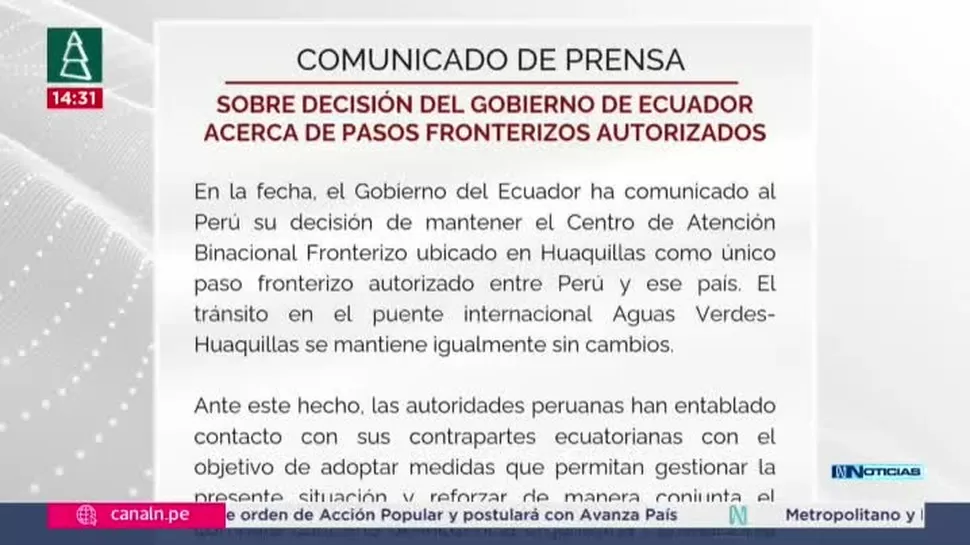En el mismo comunicado, el Ministerio de Relaciones Exteriores señaló que el tránsito en el puente internacional Aguas Verdes–Huaquillas se mantiene sin cambios. Según indicó, las operaciones en esta infraestructura continúan desarrollándose con normalidad.