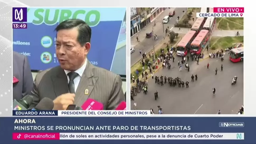 Durante su intervención sobre el paro de transportistas registrado este lunes, el presidente del Consejo de Ministros, Eduardo Arana, aseguró que el Ejecutivo trabaja en acciones concretas para enfrentar la inseguridad ciudadana.