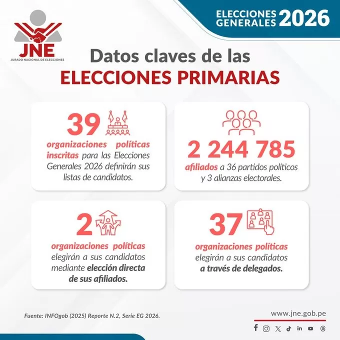 Un total de 2 244 785 afiliados participará en las elecciones primarias del 30 de noviembre y 7 de diciembre, según el JNE. Estas definirán a los candidatos para las elecciones 2026. El padrón creció más del 34 % respecto al 2021, por el incremento de partidos inscritos, que pasaron de 24 a 43. La mayoría de organizaciones aplicará la modalidad por delegados. Renovación Popular y el APRA usarán voto cerrado. Tras las primarias, las agrupaciones tendrán hasta el 23 de diciembre para inscribir listas. El proceso de calificación de candidaturas culminará el 14 de marzo de 2026.