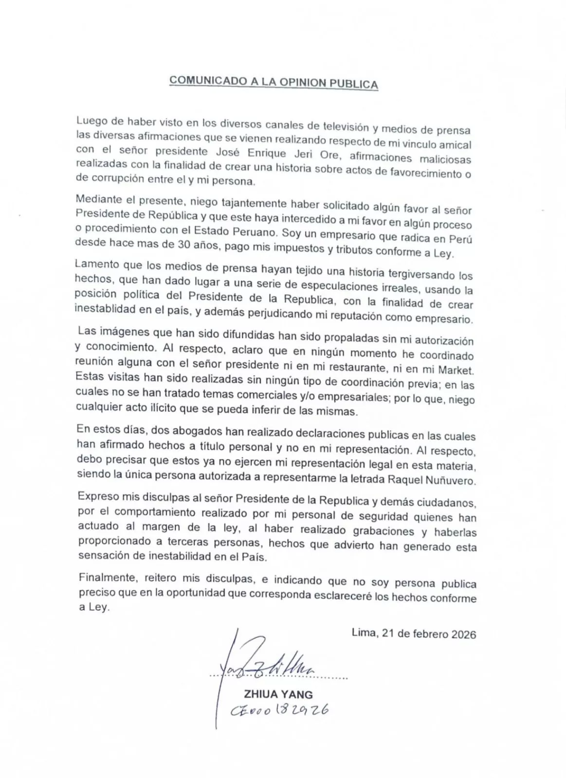 El empresario chino Zhihua Yang se pronunció mediante un comunicado para rechazar los señalamientos sobre presuntas gestiones ante el presidente de la República,José Jerí. El documento fue difundido luego de los reportajes que mostraron visitas del mandatario a su restaurante y su tienda en el Centro de Lima.