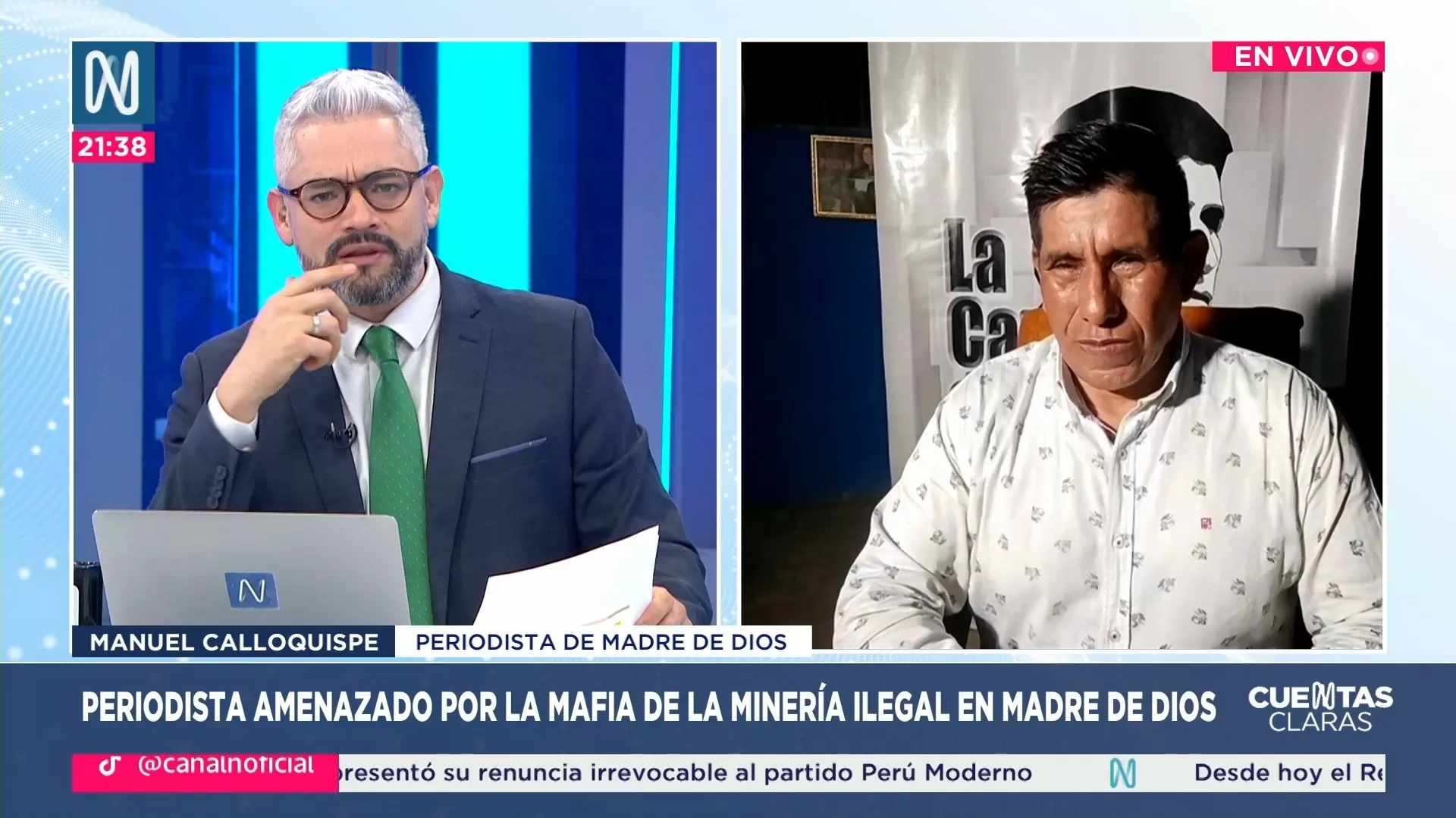 El periodista Manuel Calloquispe reveló en Canal N haber recibido amenazas de muerte por investigar a mafias de minería ilegal en Madre de Dios. Presentó un audio donde se le amenaza con asesinarlo a él y a sus familiares si continúa publicando sobre La Pampa. Señaló a Albert Carranza y Edison Fernández Pérez como responsables. El Ministerio de Justicia activó un mecanismo especial para protegerlo, en coordinación con la Policía y el Ministerio del Interior.