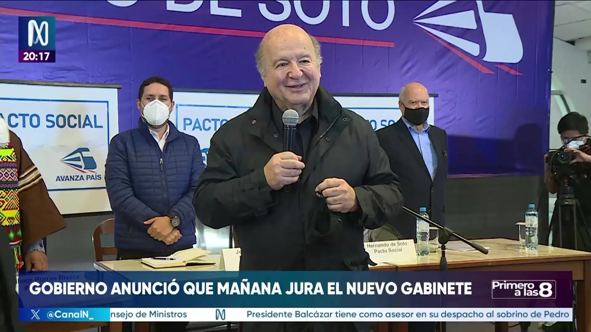 Hernando de Soto jurará este martes 24 de febrero de 2026 como presidente del Consejo de Ministros junto a 18 ministros en Palacio de Gobierno. Fue designado por el presidente José María Balcázar tras una reunión de trabajo. Bancadas del Congreso saludaron su elección, aunque indicaron que evaluarán a los ministros antes de otorgar el voto de confianza. El gabinete tendrá 30 días para presentarse ante el Parlamento. El Ejecutivo señaló que la prioridad será garantizar elecciones limpias durante el periodo transitorio. También se anunció una agenda internacional con visitas a Estados Unidos y Canadá.