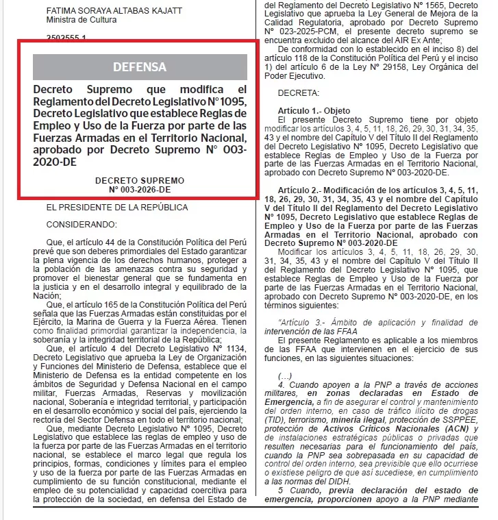 El Ejecutivo publicó un decreto que modifica la intervención de las Fuerzas Armadas en estados de emergencia, estableciendo la exención de responsabilidad penal para el personal militar en el uso de la fuerza. La norma incorpora el criterio de previsibilidad, que permite acciones preventivas antes de que la Policía sea superada. También define ámbitos de intervención en casos como terrorismo, minería ilegal y protección de servicios esenciales. Se precisan niveles de mando y planificación operativa. Además, se oficializó la designación de un nuevo viceministro en el sector Defensa y se dispusieron medidas de comunicación en lenguas indígenas.