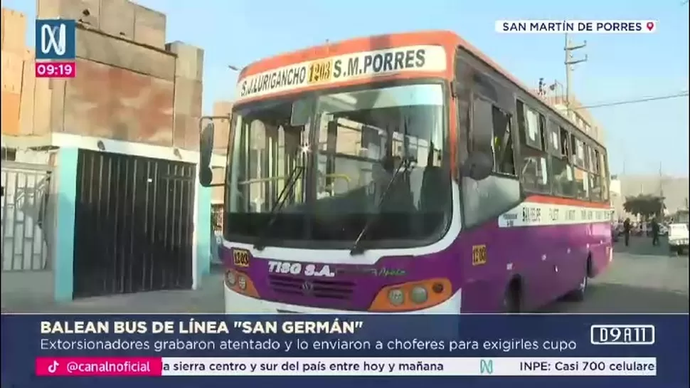 En pleno estado de emergencia, un bus de la empresa San Germán fue atacado a balazos en San Martín de Porres por presuntos extorsionadores. El hecho ocurrió el domingo a las 3:29 p. m., en la avenida Germán Aguirre, cerca del cruce con la calle Las Magnolias.