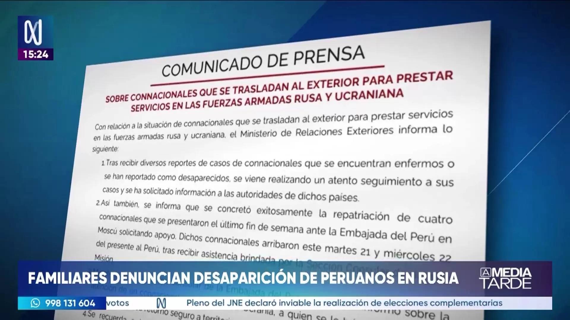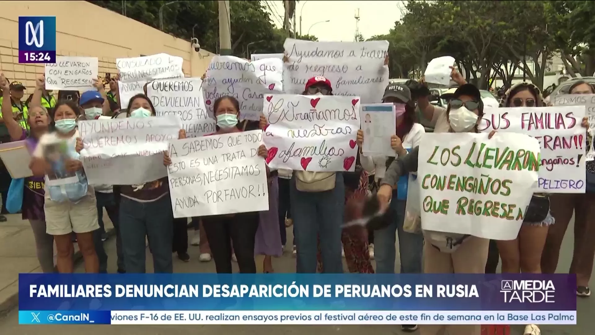 Familiares de decenas de ciudadanos peruanos denunciaron la desaparición de sus parientes en Rusia tras perder comunicación con ellos hace semanas. Los afectados realizaron un plantón frente a la embajada rusa en Lima exigiendo su pronta repatriación y denunciando que fueron reclutados bajo engaños para el ejército. Mientras algunos familiares confirmaron decesos, la Cancillería del Perú informó que realiza seguimiento a los casos de desaparecidos y confirmó el retorno de cuatro connacionales esta semana. Las familias aseguran que las promesas de pagos de 20000 no se cumplieron y que sus parientes se encuentran atrapados en zonas de conflicto bélico.