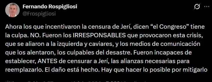 El legislador indicó que quienes promovieron la censura fueron incapaces de establecer, antes de retirar a Jerí, las alianzas necesarias para reemplazarlo. Señaló que el daño ya está hecho y que ahora corresponde hacer lo posible por mitigarlo.
