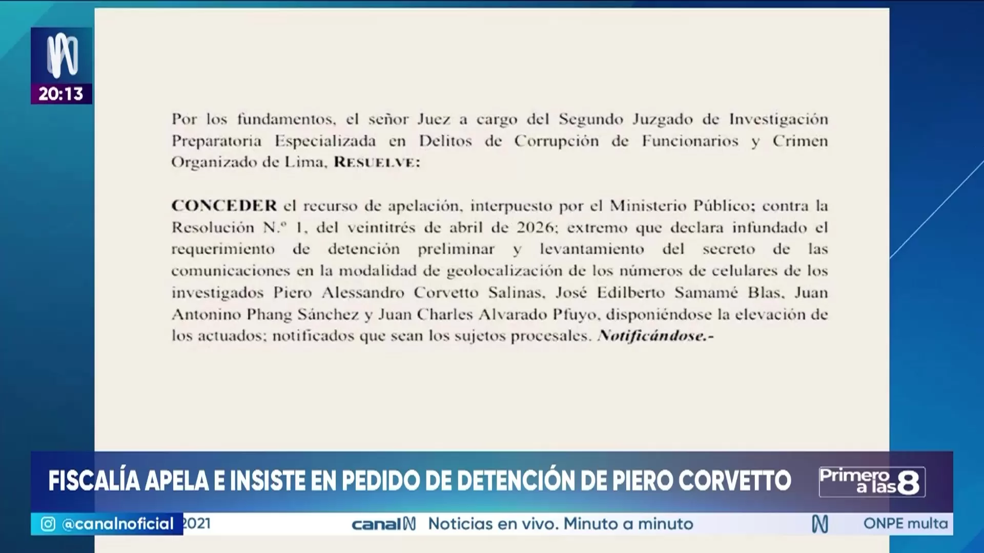 El recurso de apelación será elevado a una sala superior para que otros magistrados decidan si Piero Corvetto debe cumplir la detención preliminar solicitada. La fiscalía espera que la instancia correspondiente valore los nuevos elementos aportados sobre la presunta red de corrupción que habría operado en las elecciones del 12 de abril.