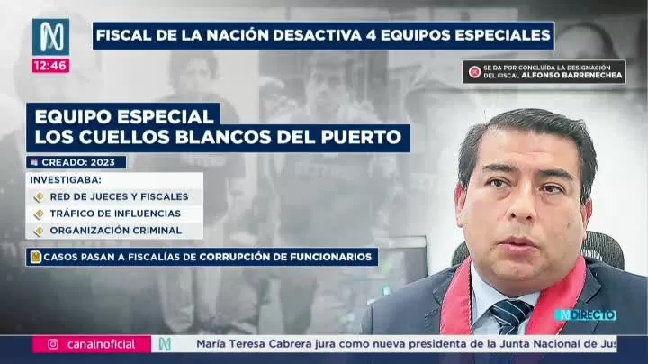 El fiscal de la Nación interino, Tomás Gálvez, ordenó la disolución de los equipos especiales Lava Jato, Cuellos Blancos, Eficcop y Eficavip. Las investigaciones fueron transferidas a fiscalías especializadas del esquema ordinario. José Domingo Pérez no fue incluido en ninguna reasignación. Gálvez rechazó motivaciones personales o de represalia, alegando que su caso fue archivado en 2021. Justificó la medida señalando que estos grupos actuaban con autonomía excesiva. La desactivación incluye la salida de más de 70 fiscales y un reordenamiento institucional que, según indicó, busca recuperar el control jerárquico en el Ministerio Público.