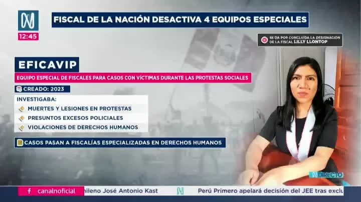 Por medio de la Resolución N.º 005-2026-MP-FN, se dispuso la disolución del Eficavip, equipo creado en marzo de 2023 para investigar los más de 50 fallecimientos durante las protestas sociales. La decisión implica la integración de sus casos al Subsistema de Fiscalías Especializadas en Derechos Humanos.