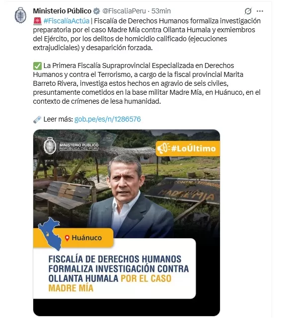 La Fiscalía formalizó una investigación preparatoria contra el expresidente Ollanta Humala por el caso Madre Mía, relacionado con presuntos crímenes cometidos en la región Huánuco durante el año 1992. La medida alcanza también a cuatro exmiembros del Ejército del Perú que operaron en esa zona bajo el mando de Humala, quien entonces usaba el seudónimo “Capitán Carlos”.