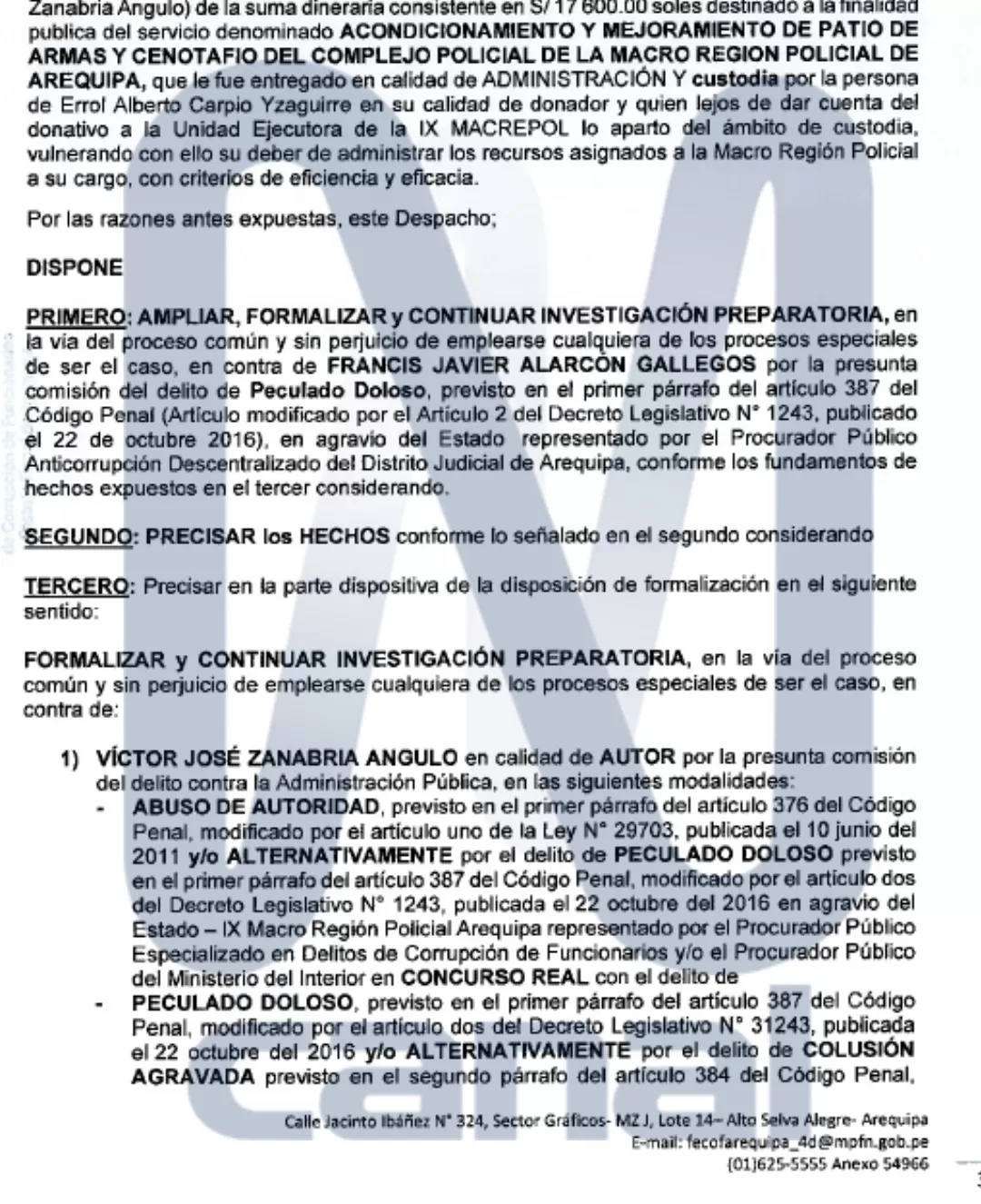 La Fiscalía de Arequipa formalizó y continuará con la investigación preparatoria contra el actual comandante general de la Policía Nacional, Víctor José Zanabria Angulo, por presuntos delitos relacionados con su gestión en la IX Macro Región Policial de Arequipa.