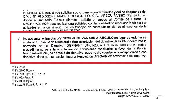 Además del comandante general Zanabria, figuran como imputados el coronel Francis Alarcón Gallegos, el coronel Luis Cancela Roggero, el suboficial Rodríguez Bilbao y Claudia del Castillo Chávez, todos exfuncionarios de la IX MACREPOL Arequipa.