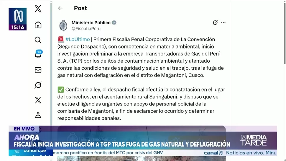 La Transportadora de Gas del Perú (TGP) es investigada por una fuga de gas natural con deflagración registrada en el distrito de Megantoni, en Cusco. La Primera Fiscalía Penal Corporativa de La Convención inició una investigación preliminar por presuntos delitos vinculados a contaminación ambiental y seguridad en el trabajo.