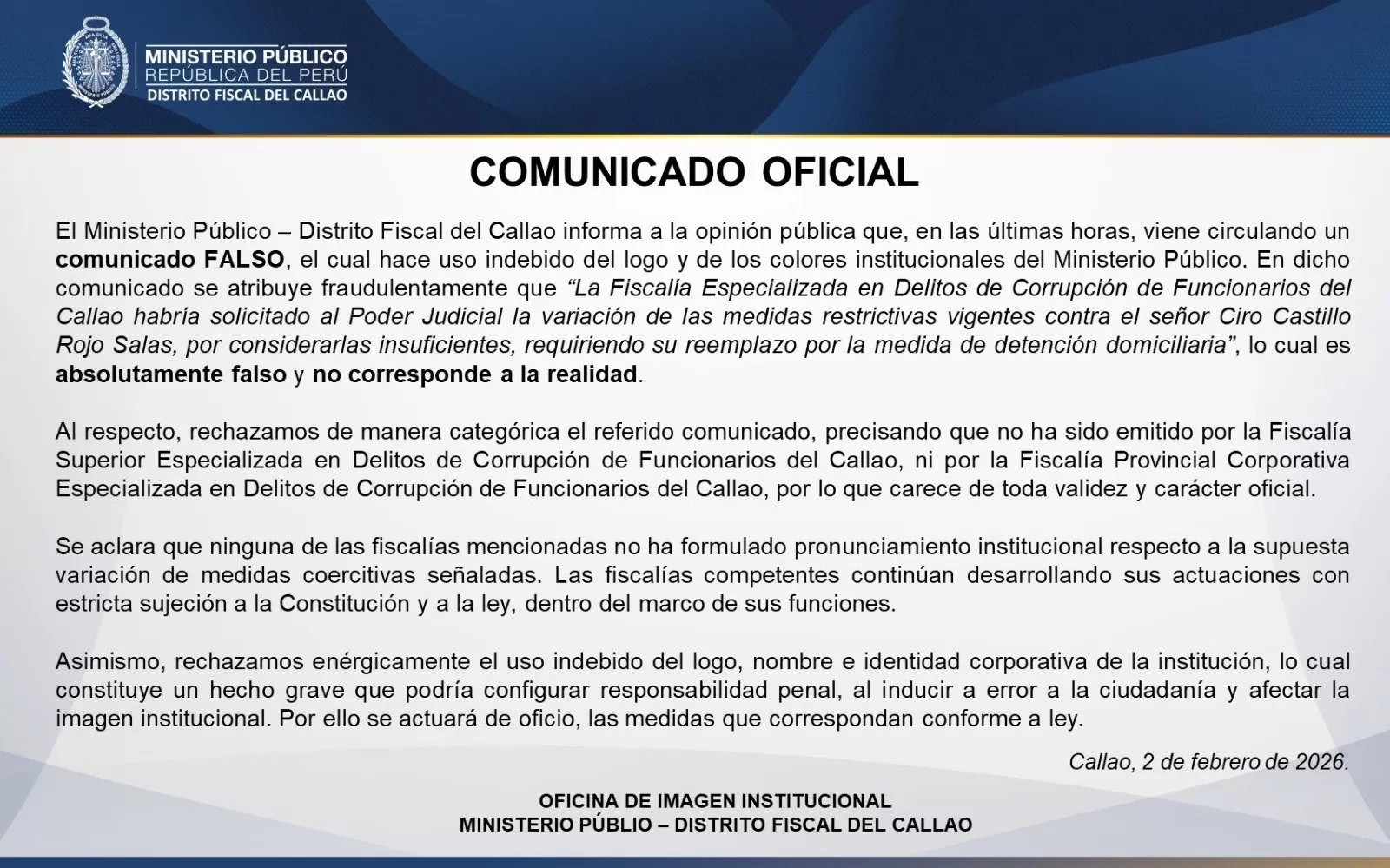 La Fiscalía del Callao negó haber solicitado la detención domiciliaria de Ciro Castillo Rojo y alertó sobre la difusión de un comunicado falso que usó indebidamente su identidad institucional. El Ministerio Público precisó que ninguna fiscalía especializada emitió dicho pronunciamiento y anunció que actuará de oficio ante un hecho que podría generar responsabilidad penal. El comunicado fue emitido el 2 de febrero de 2026. En paralelo, Castillo Rojo acudió al Gobierno Regional del Callao tras la anulación de su prisión preventiva, mientras se reforzaron las medidas de seguridad en la sede regional.