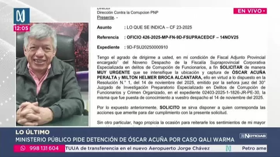 El Ministerio Público ha solicitado intensificar la búsqueda y captura de Óscar Acuña Peralta, hermano del excandidato presidencial César Acuña, en el marco de una investigación sobre una presunta red criminal que operaba dentro del programa social Qali Warma.