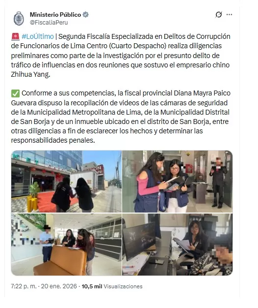 La Fiscalía de la Nación abrió diligencias preliminares contra el presidente José Jerí por sus reuniones con el empresario chino Zhihua Yang. Se investigan posibles delitos de patrocinio ilegal y tráfico de influencias. La fiscal Diana Paico ordenó recopilar grabaciones de cámaras de seguridad de Lima y San Borja. Las visitas no registradas del mandatario ocurrieron el 26 de diciembre y el 6 de enero. El Ejecutivo no ha emitido declaraciones tras el inicio del proceso, mientras que el premier Álvarez afirmó que Jerí fue víctima de una “trampa”. La investigación continúa bajo reserva por la investidura presidencial.
