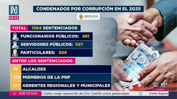 Entre los sentenciados figuran 76 alcaldes, 170 efectivos policiales y 177 gerentes regionales y municipales. Según precisó Tello, estas cifras muestran una ligera reducción respecto al 2024, cuando se registraron 2.078 condenados.