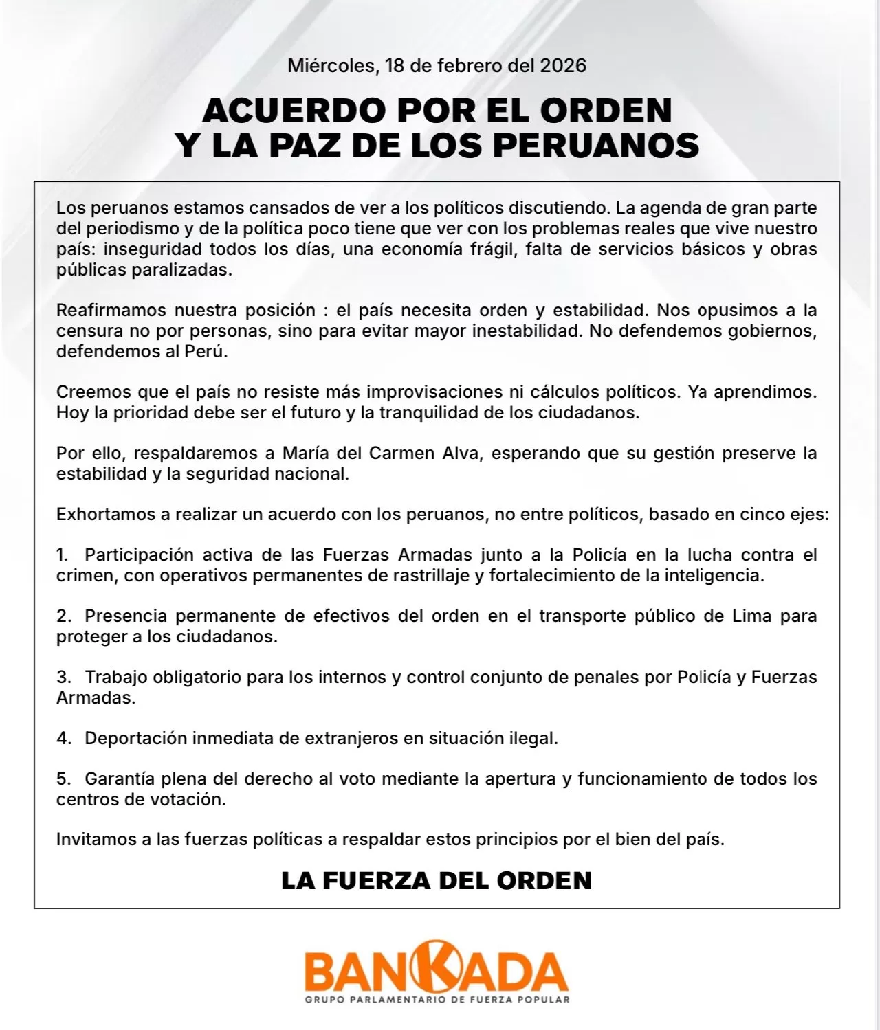 El pronunciamiento, difundido el 18 de febrero de 2026 bajo el título “Acuerdo por el orden y la paz de los peruanos”, señala que el país necesita orden y estabilidad. La bancada indicó que se opuso a la censura “no por personas, sino para evitar mayor inestabilidad” y afirmó que no defiende gobiernos, sino al Perú.