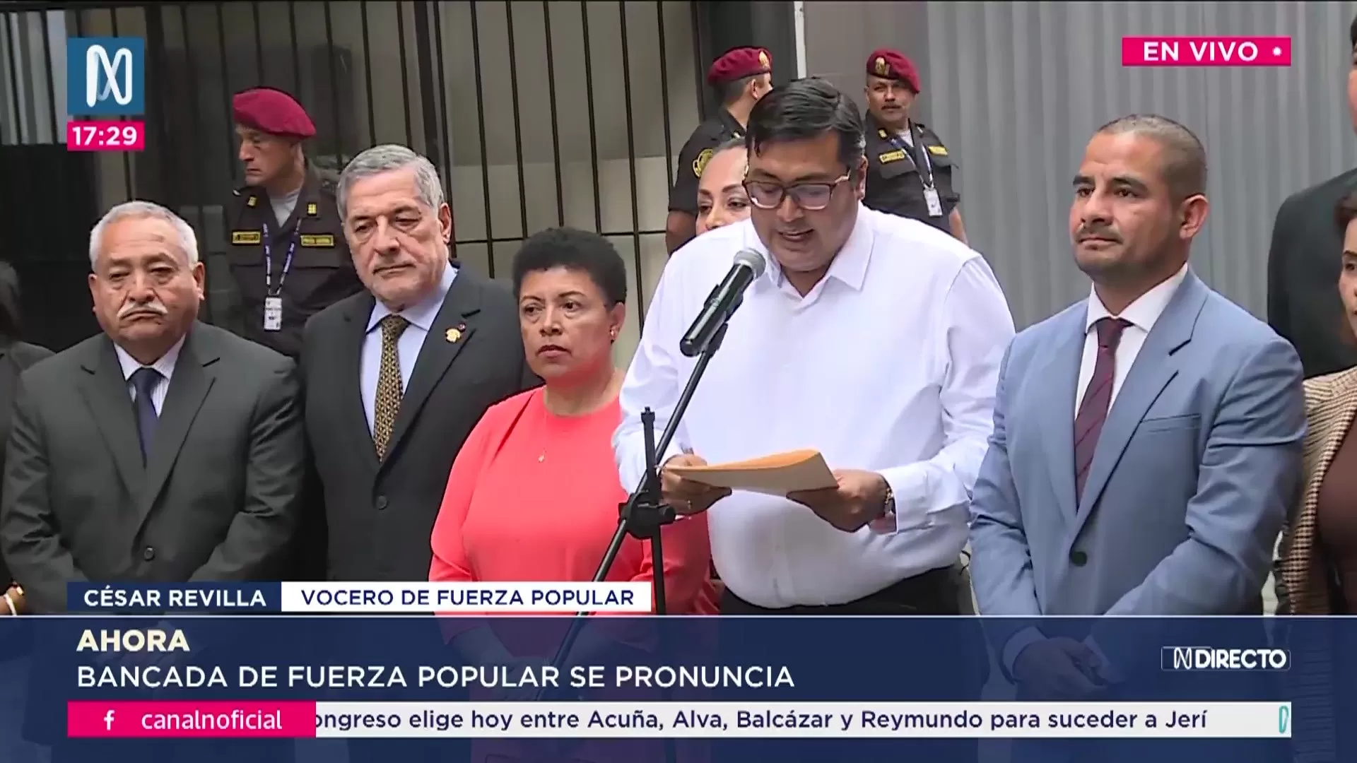 El vocero de la bancada de Fuerza Popular, César Revilla, informó que su grupo parlamentario respaldará la candidatura de María del Carmen Alva en la elección del nuevo presidente del Congreso de la República, quien asumirá también la Presidencia de la República tras la reciente censura.