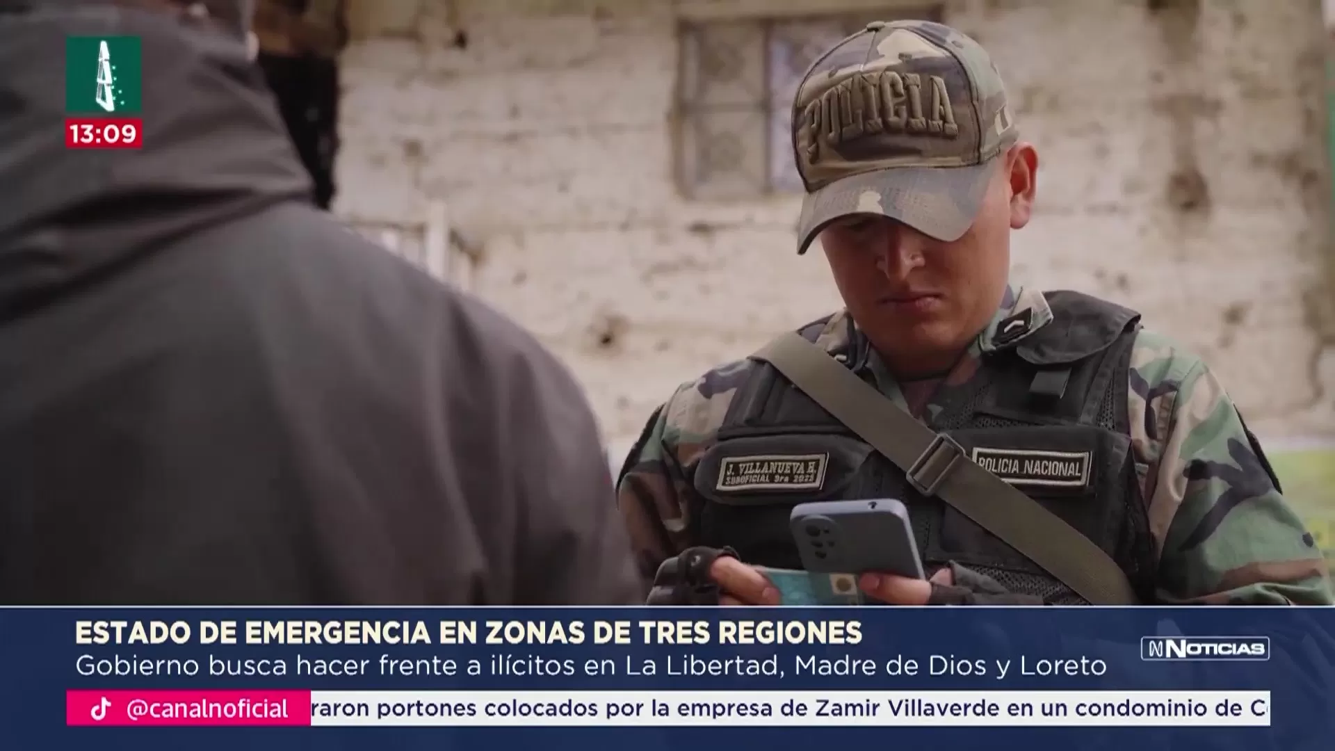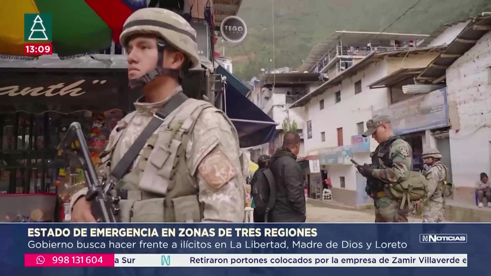 El Gobierno decretó el estado de emergencia por 60 días en zonas críticas de La Libertad, Madre de Dios y Loreto para enfrentar minería ilegal, crimen organizado y grupos hostiles. Las Fuerzas Armadas asumirán el control del orden interno en zonas como Pataz y Putumayo. En Madre de Dios, la Policía liderará los operativos con apoyo militar. Se estableció inmovilización nocturna en Pataz. Además, el Ejecutivo declaró estado de emergencia en Tacna por ingreso irregular de migrantes. Las medidas buscan reforzar la presencia estatal, intensificar patrullajes y asegurar el control territorial y fronterizo en regiones priorizadas.