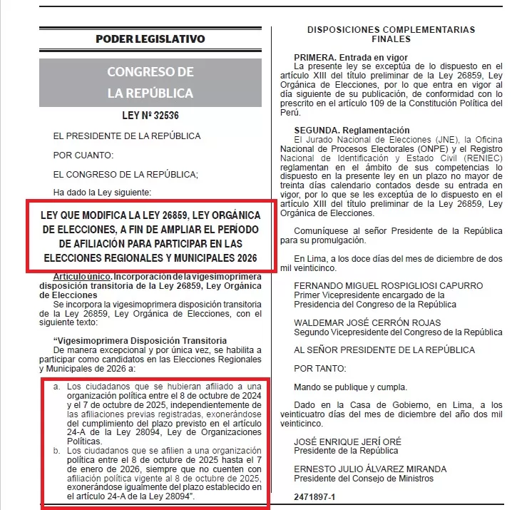 Publicado el 25 de diciembre en el diario oficial El Peruano, el Gobierno promulgó la Ley 32536, que amplía de manera excepcional el periodo de afiliación política para postular en las Elecciones Regionales y Municipales de 2026. La norma establece nuevos plazos temporales que permiten la participación de ciudadanos con afiliación reciente, sin aplicar los requisitos usuales previstos en la legislación vigente.
