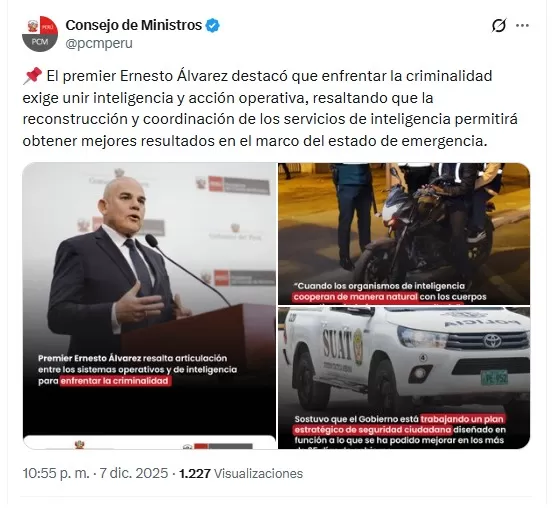 El presidente del Consejo de Ministros, Ernesto Álvarez, anunció que los servicios de inteligencia de las Fuerzas Armadas, la Policía Nacional, el Ministerio del Interior y la Unidad de Inteligencia Financiera están trabajando de manera coordinada para enfrentar la lucha contra la criminalidad en el país. Estas acciones se integran en el contexto del estado de emergencia decretado en varias regiones.