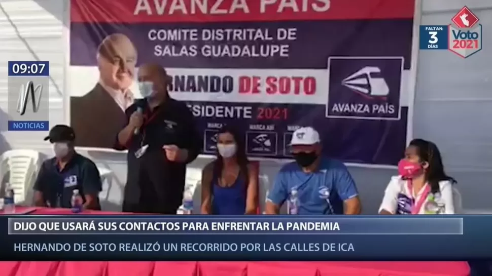 El candidato presidencial por Avanza País, Hernando de Soto, señaló que su agrupación política es la "mejor vinculada con el resto del mundo" y que conocen más jefes de Estados que "nuestros propios presidentes", algo que usarán para luchar contra la pandemia del coronavirus.