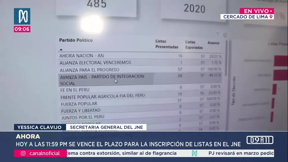 Hasta las primeras horas del día, el JNE reportó el ingreso de 485 listas y 12 fórmulas presidenciales. Estas cifras representan solo el 24,01% del total esperado (2,020 listas). Asimismo, ya se han registrado más de 2,120 hojas de vida.