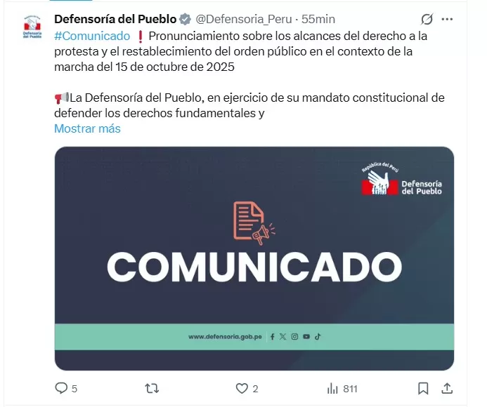 El organismo constitucional publicó un comunicado expresando su preocupación por los hechos registrados durante las movilizaciones del 15 de octubre. Según el documento, la mayoría de heridos presentaron lesiones de tipo policontuso. La Defensoría destacó que el derecho a la protesta está garantizado por la Constitución y tratados internacionales de derechos humanos, pero debe ejercerse de manera pacífica.