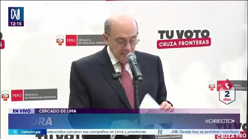 El canciller hizo un llamado a los peruanos residentes fuera del país a participar en la jornada electoral. “Cada compatriota en el exterior tiene que cumplir con su deber cívico y contribuir al fortalecimiento de la democracia”, señaló.