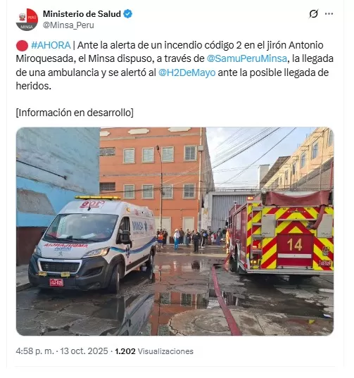 El Centro de Operaciones de Emergencia Nacional (COEN) informó del incendio a través de su cuenta oficial en la red social X. En su publicación, indicó que se trataba de un incendio urbano de código 2 en el Cercado de Lima, e instó a la ciudadanía a respetar las indicaciones de las autoridades y mantenerse alejados de la zona de emergencia.