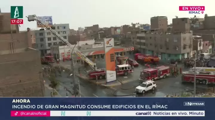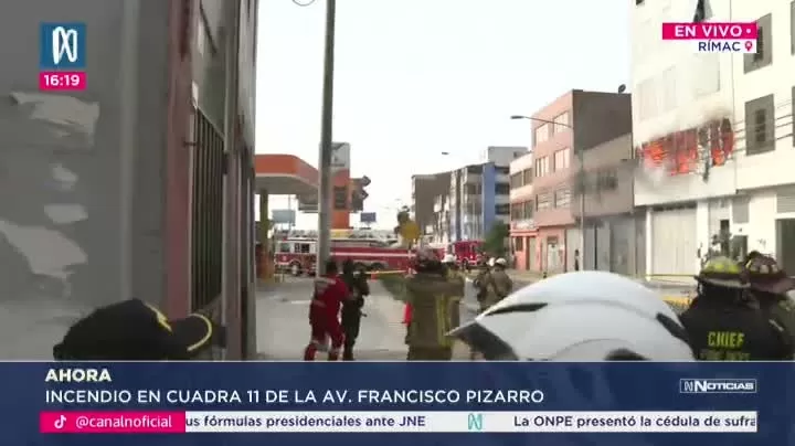 Un incendio de gran magnitud se registró la tarde del 25 de diciembre en la cuadra 11 de la avenida Francisco Pizarro, en el distrito del Rímac. El fuego afectó un edificio blanco de seis pisos, donde funcionaba un almacén, y quemó cables de servicio público. La emergencia ocurrió a solo 30 metros de un grifo que distribuye GLP. Al menos 23 unidades de bomberos acudieron al lugar. También se reportó un incendio paralelo en un inmueble posterior. Las autoridades pidieron evacuar la zona por riesgo de explosiones. No se han reportado víctimas hasta el momento. Las causas aún se investigan.