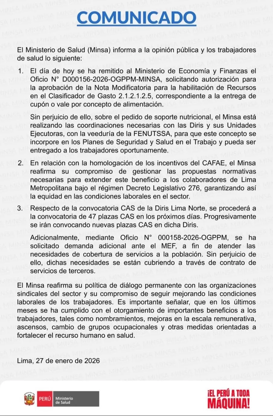 En respuesta, el Ministerio de Salud emitió un comunicado señalando que ya ha solicitado al Ministerio de Economía y Finanzas la autorización para transferencias presupuestales que atiendan estas demandas.