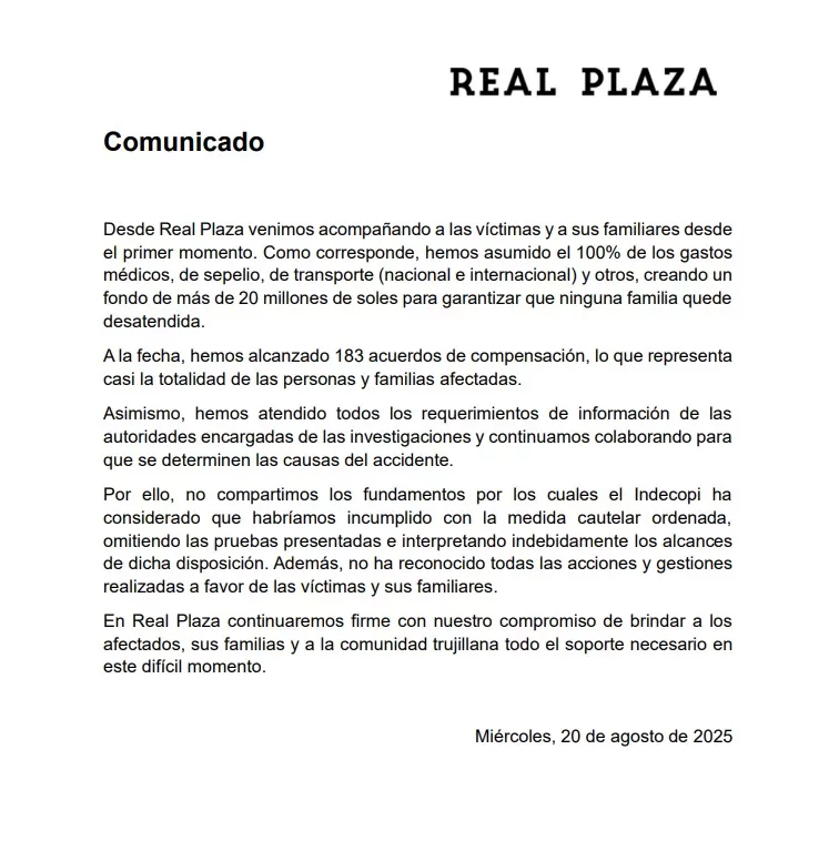 El pasado 21 de febrero, el desplome de parte del techo en el patio de comidas del centro comercial Real Plaza de Trujillo provocó víctimas mortales y dejó a varios heridos. El hecho generó preocupación pública y derivó en la intervención inmediata de las autoridades de fiscalización y defensa del consumidor.